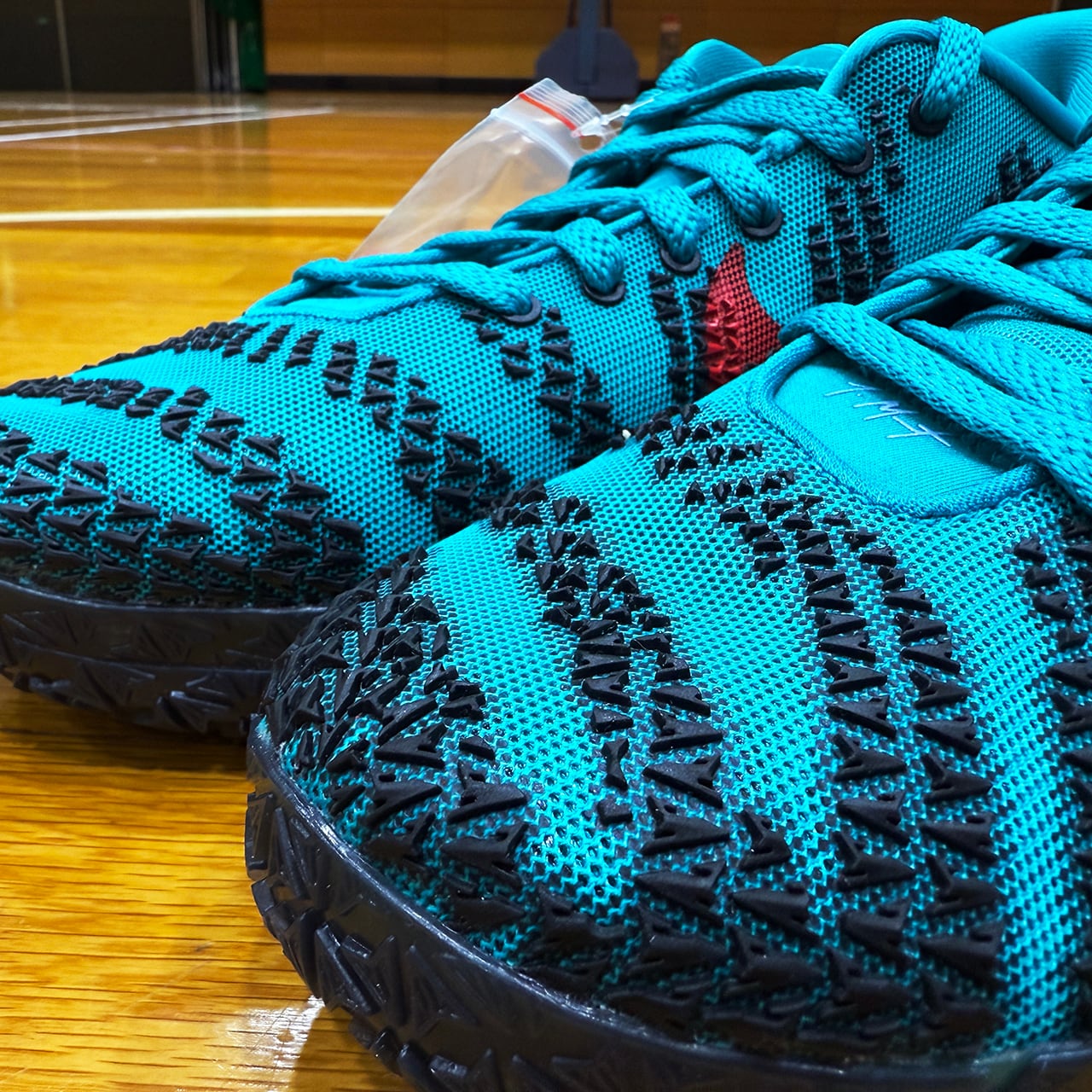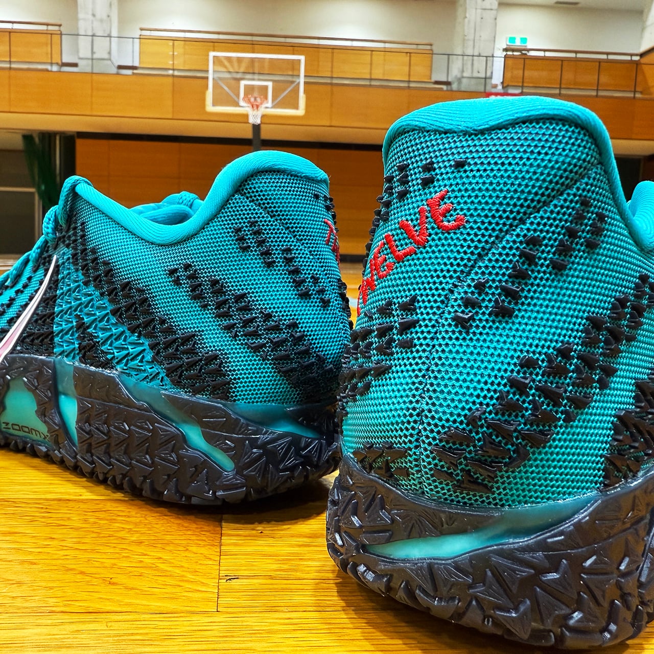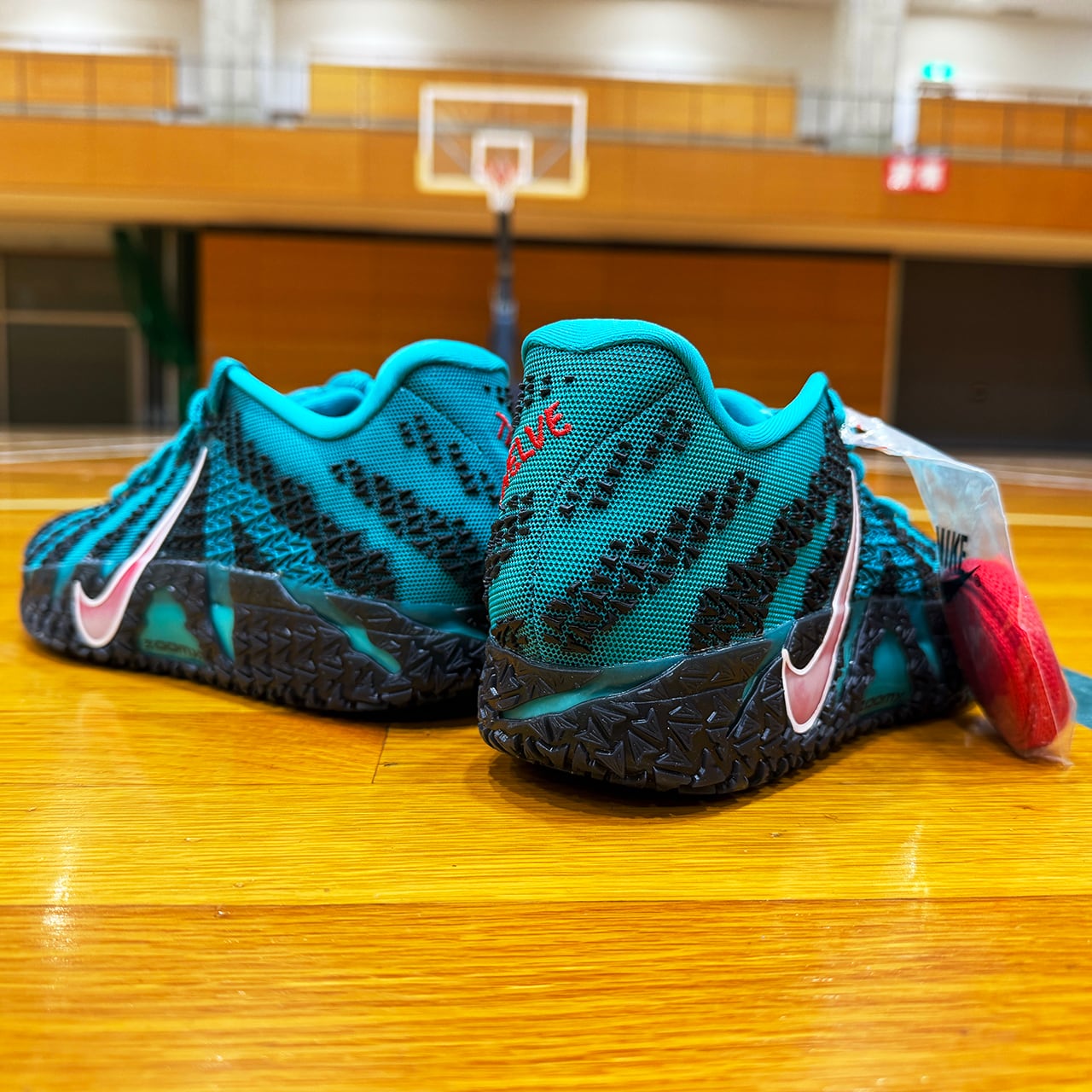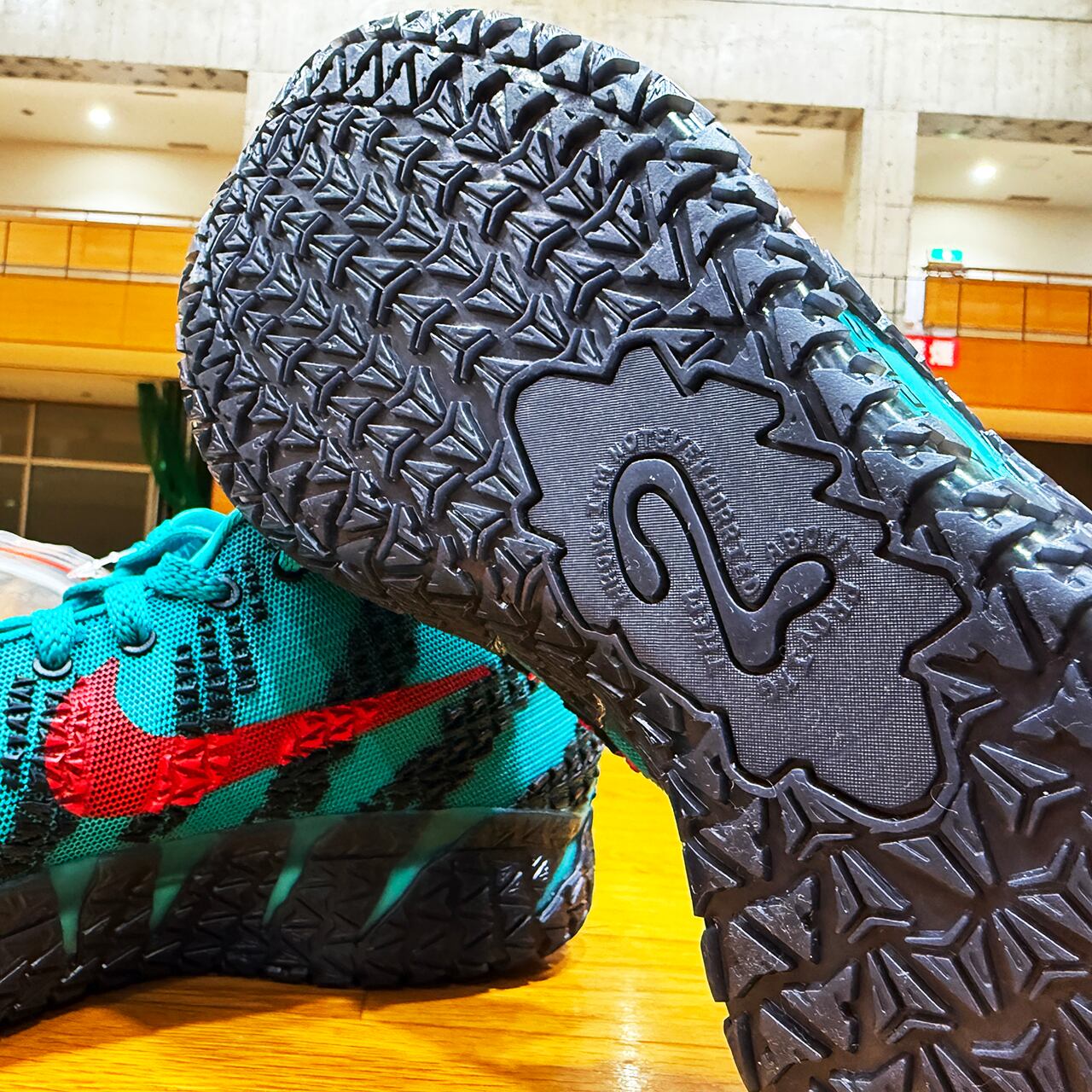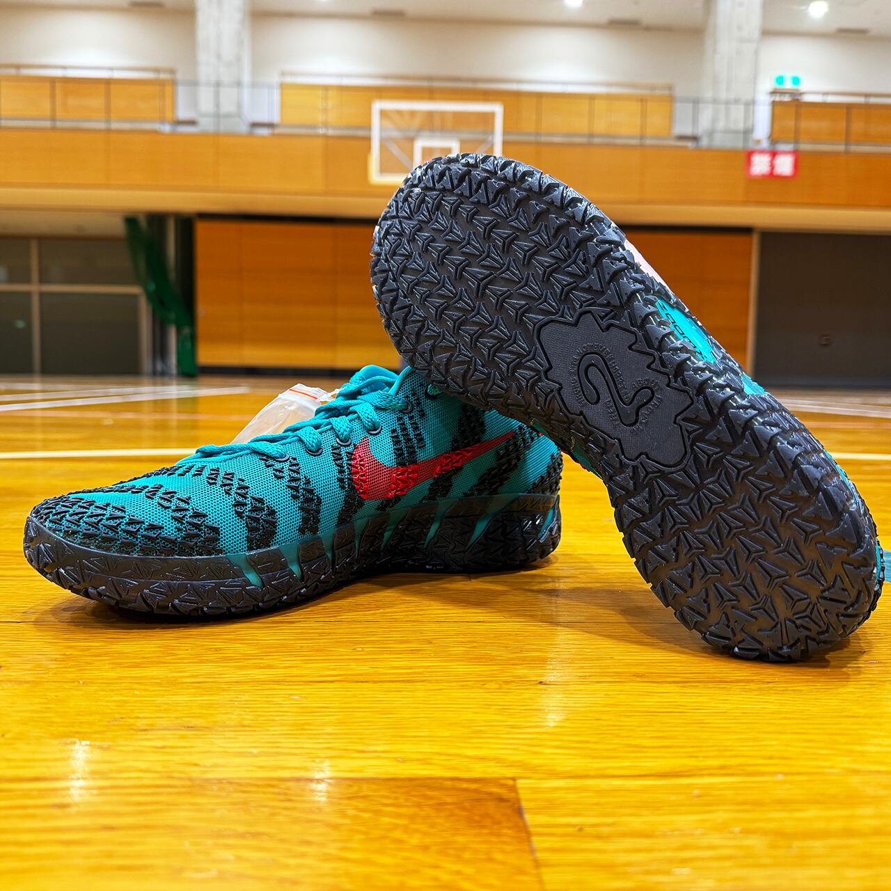 アッパー全体を包み込む鮮烈なターボグリーンがジャ・モラントの爆発的なプレーを象徴するように放たれています。