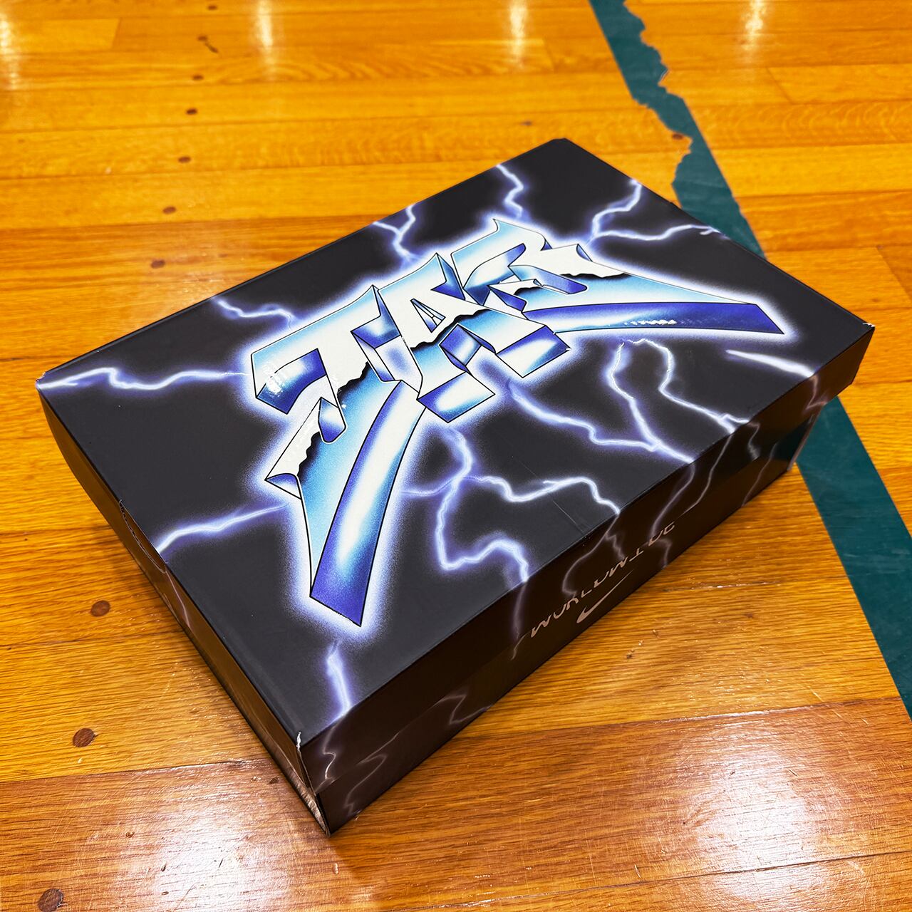 サイドにはグラフィティ風に描かれたスウッシュロゴが縦方向に配置されアートとストリートカルチャーの境界を曖昧にするような存在感を放っています。