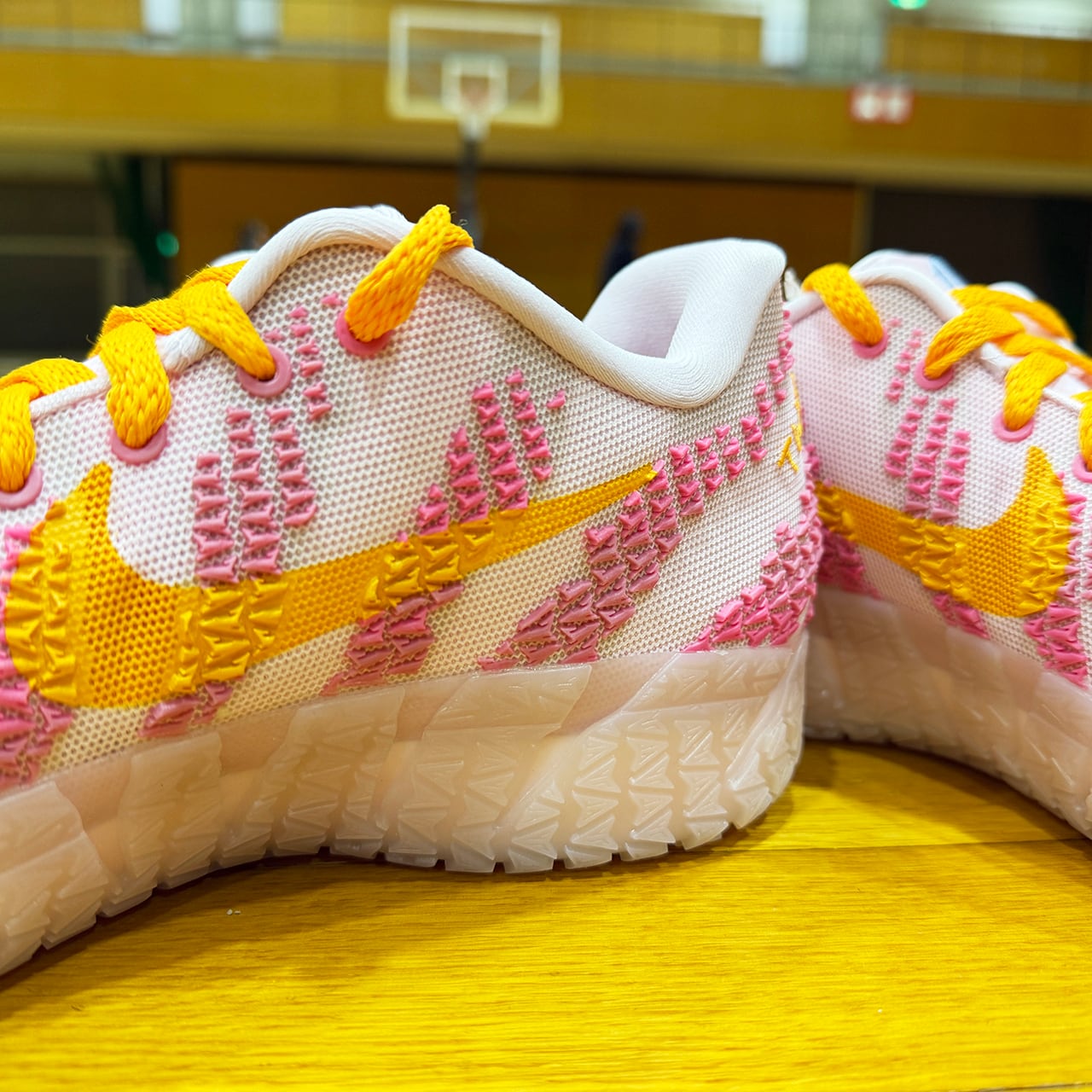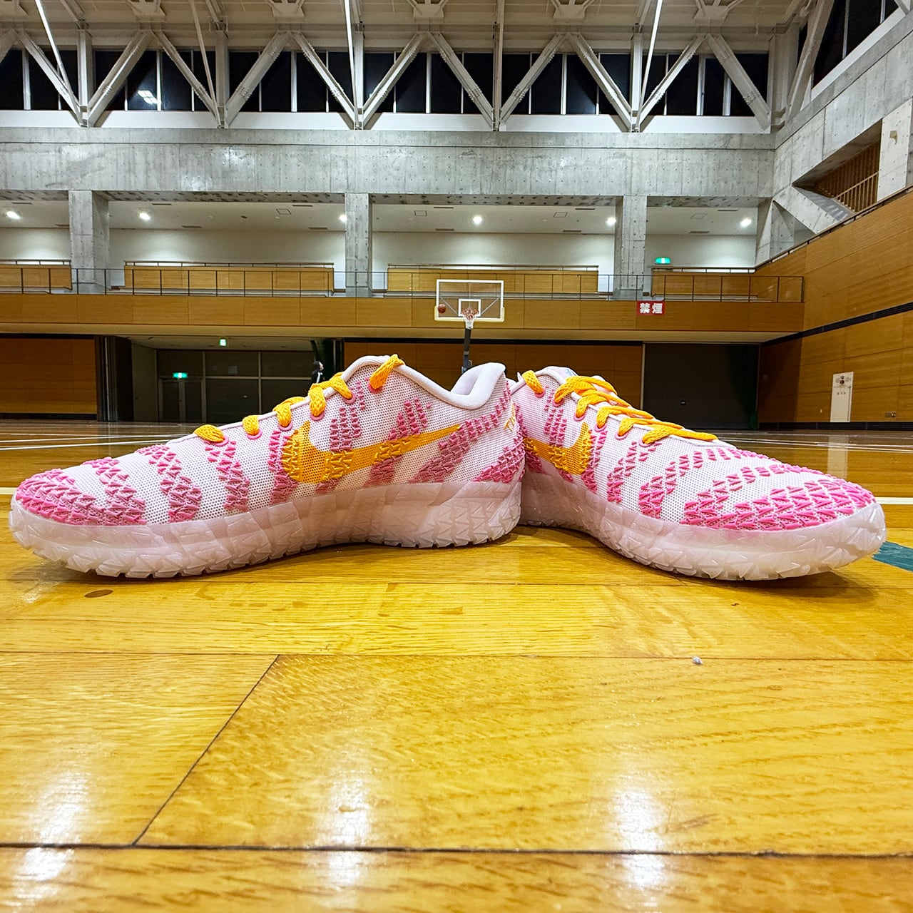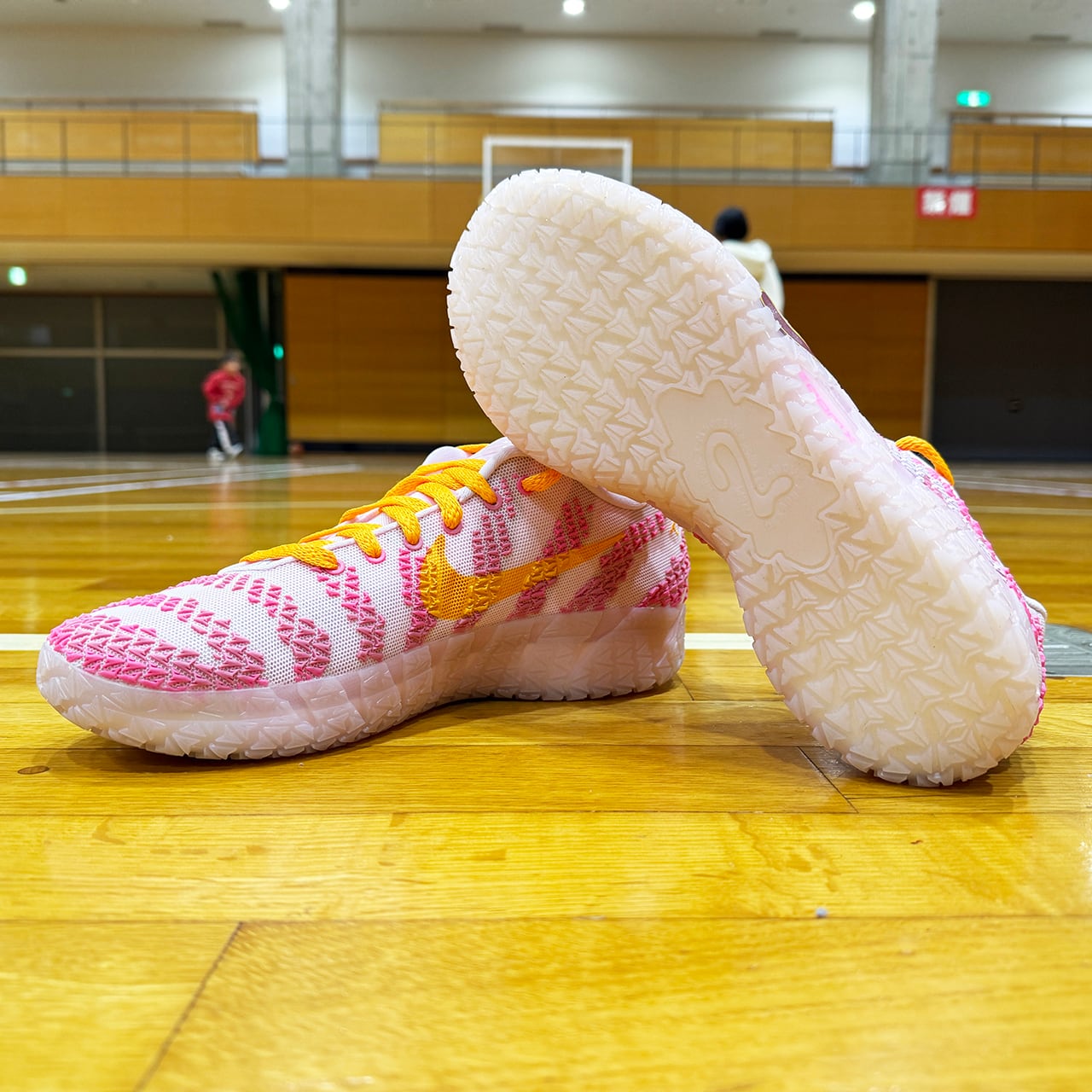 今作はベースアッパーからスクラッチパターン、そして半透明のアウトソールに至るまで、全体をキュートなピンクで彩色。