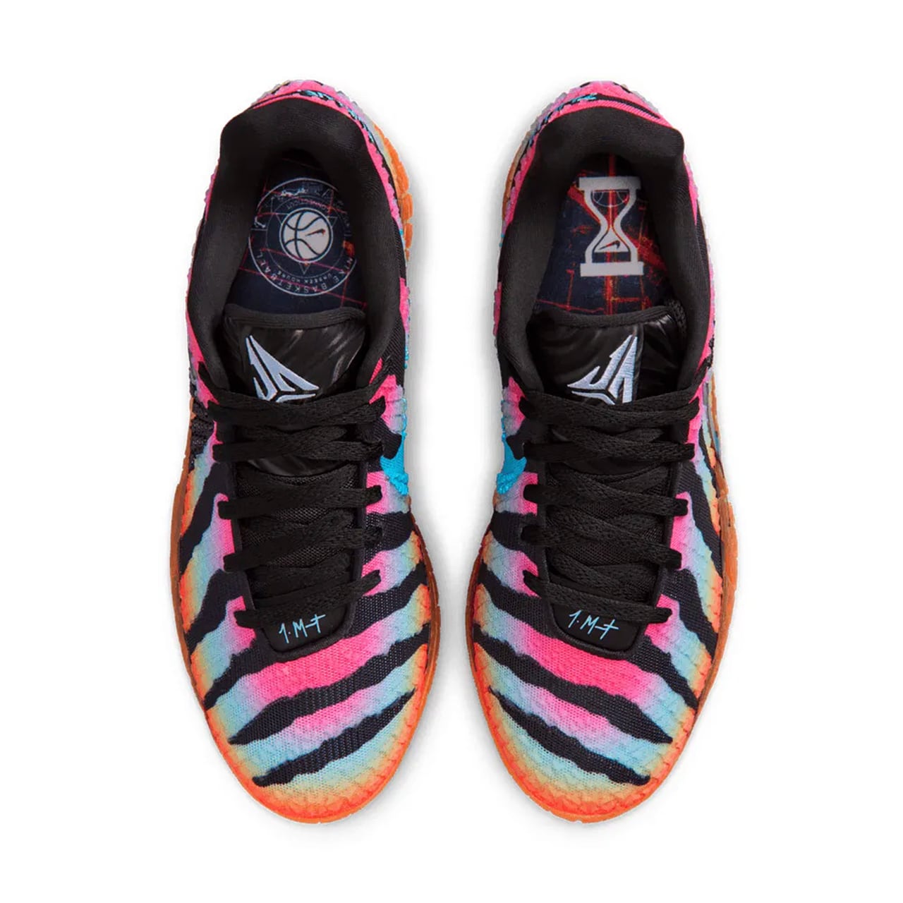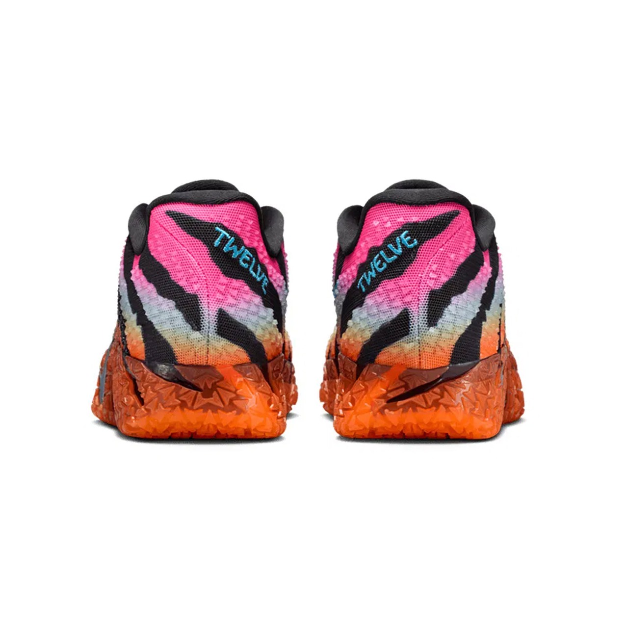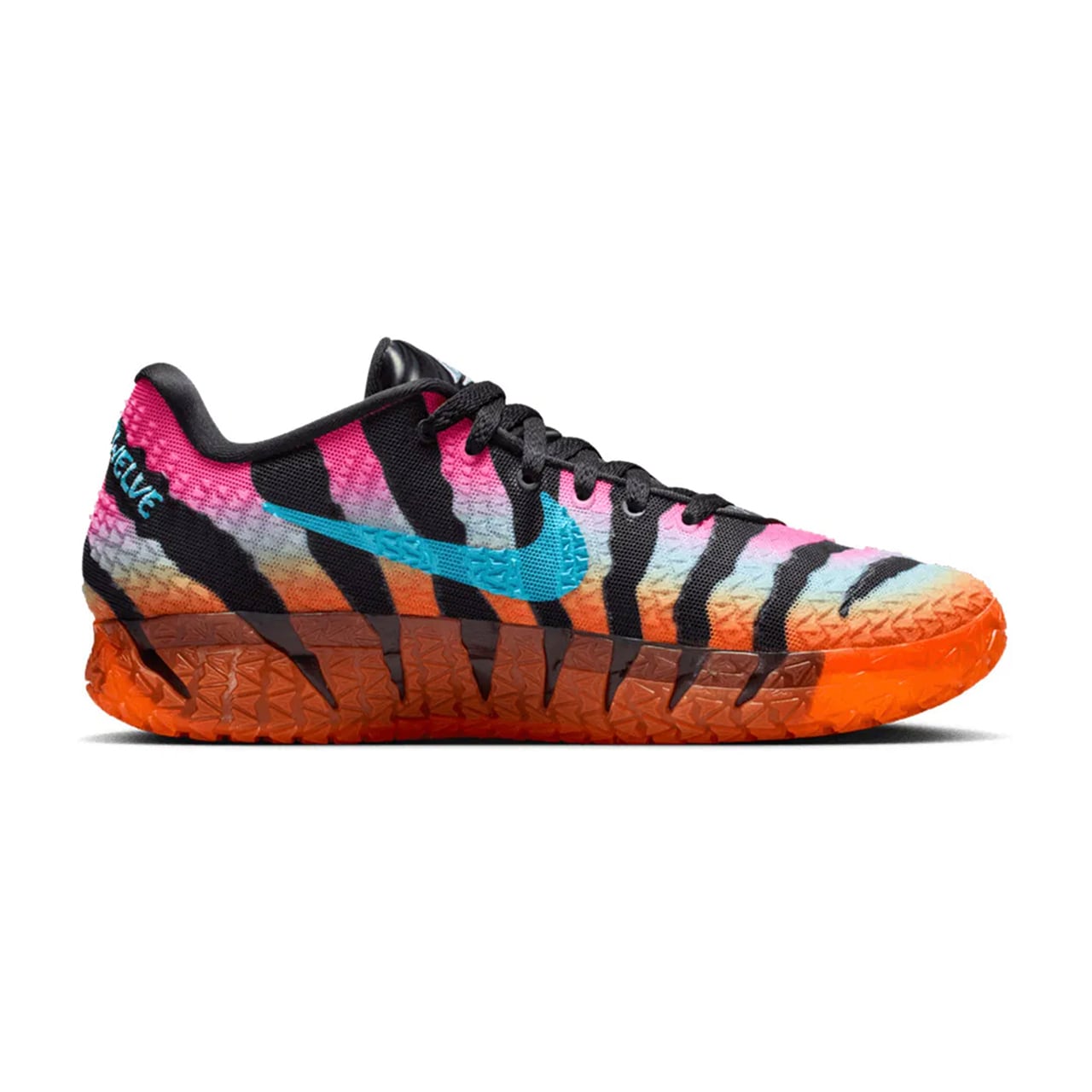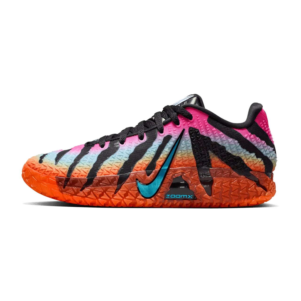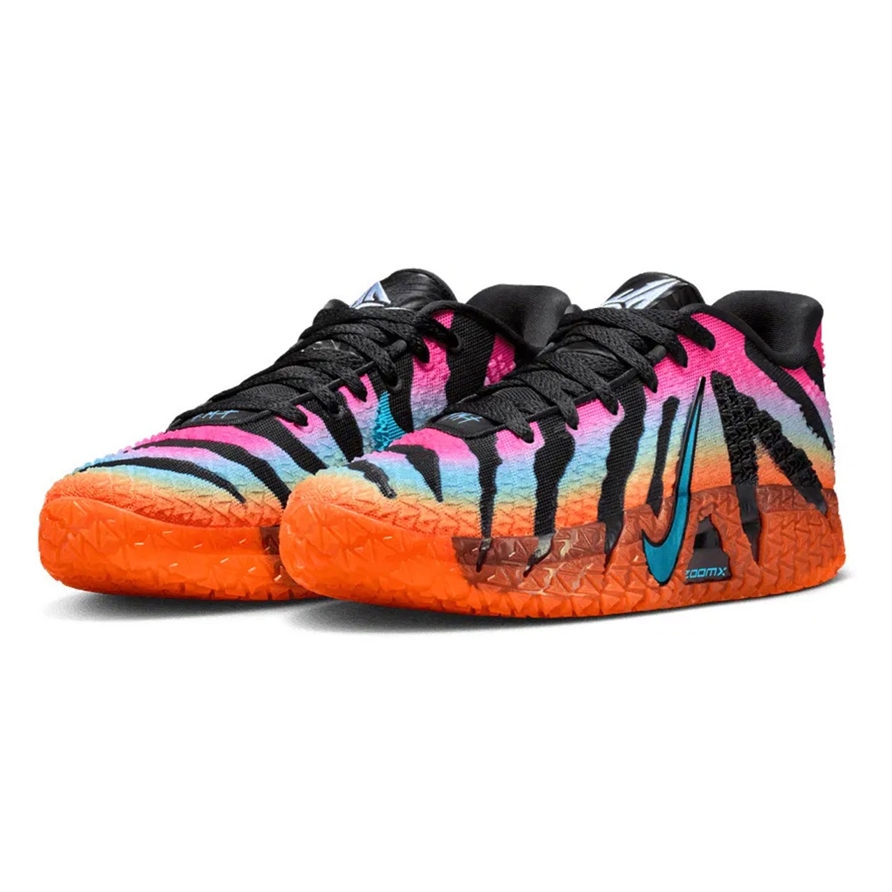アッパー全体には、ブラックを基調としたタイガーパターンのような力強いグラフィックが施されており、その背景にはハイパーピンク、バルチックブルー、トータルオレンジのグラデーションが鮮やかに広がっています。