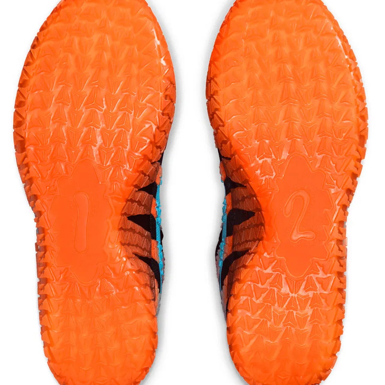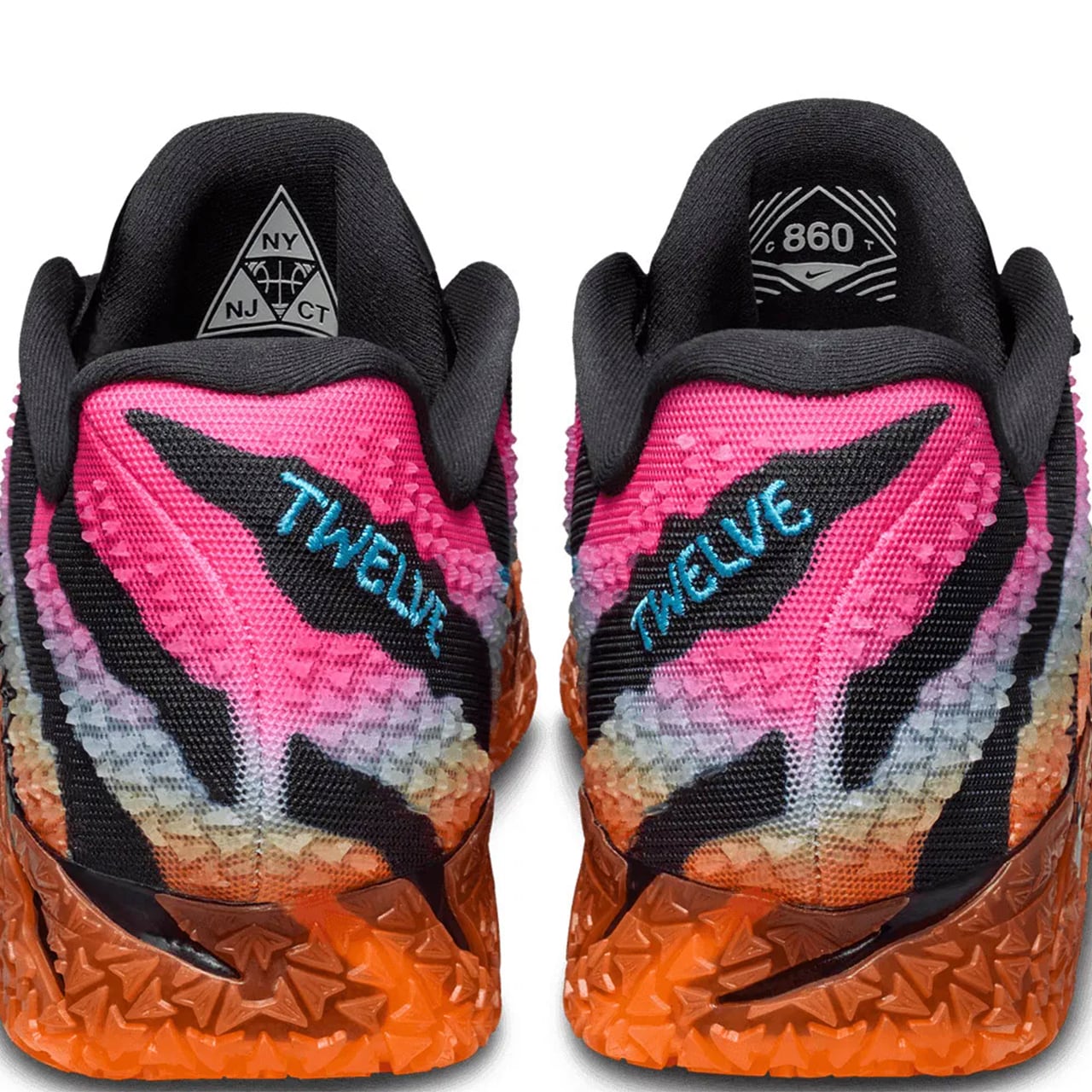 履き口周りは柔らかなブラックのパッドで保護されており、機能性と快適性を高めています。かかと部分にはスカイブルーの糸で十二を意味する刺繍が刻まれ、その周囲にはギザギザとした立体的な樹脂パーツが装飾されており、鋭利で攻撃的なシルエットを形作っています。