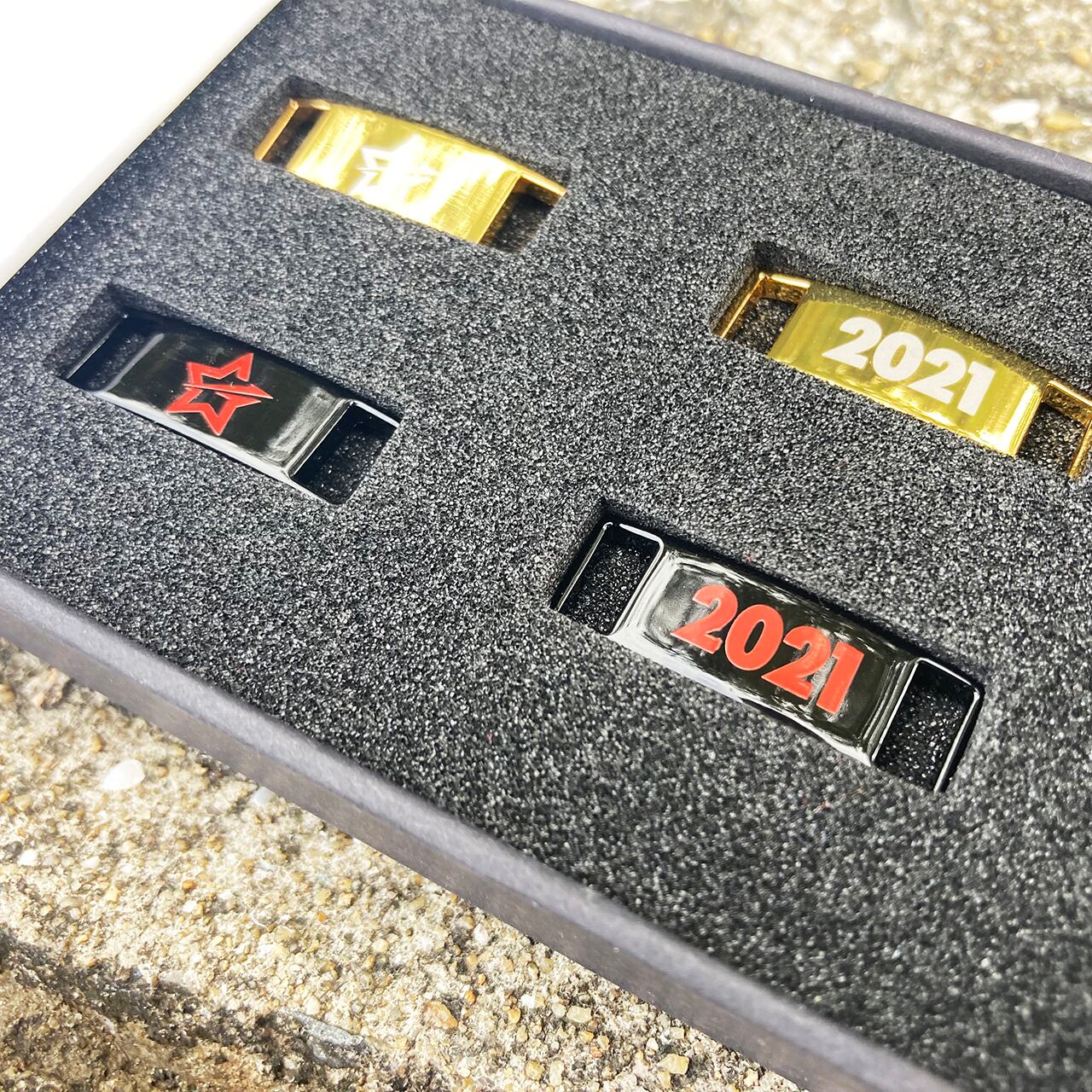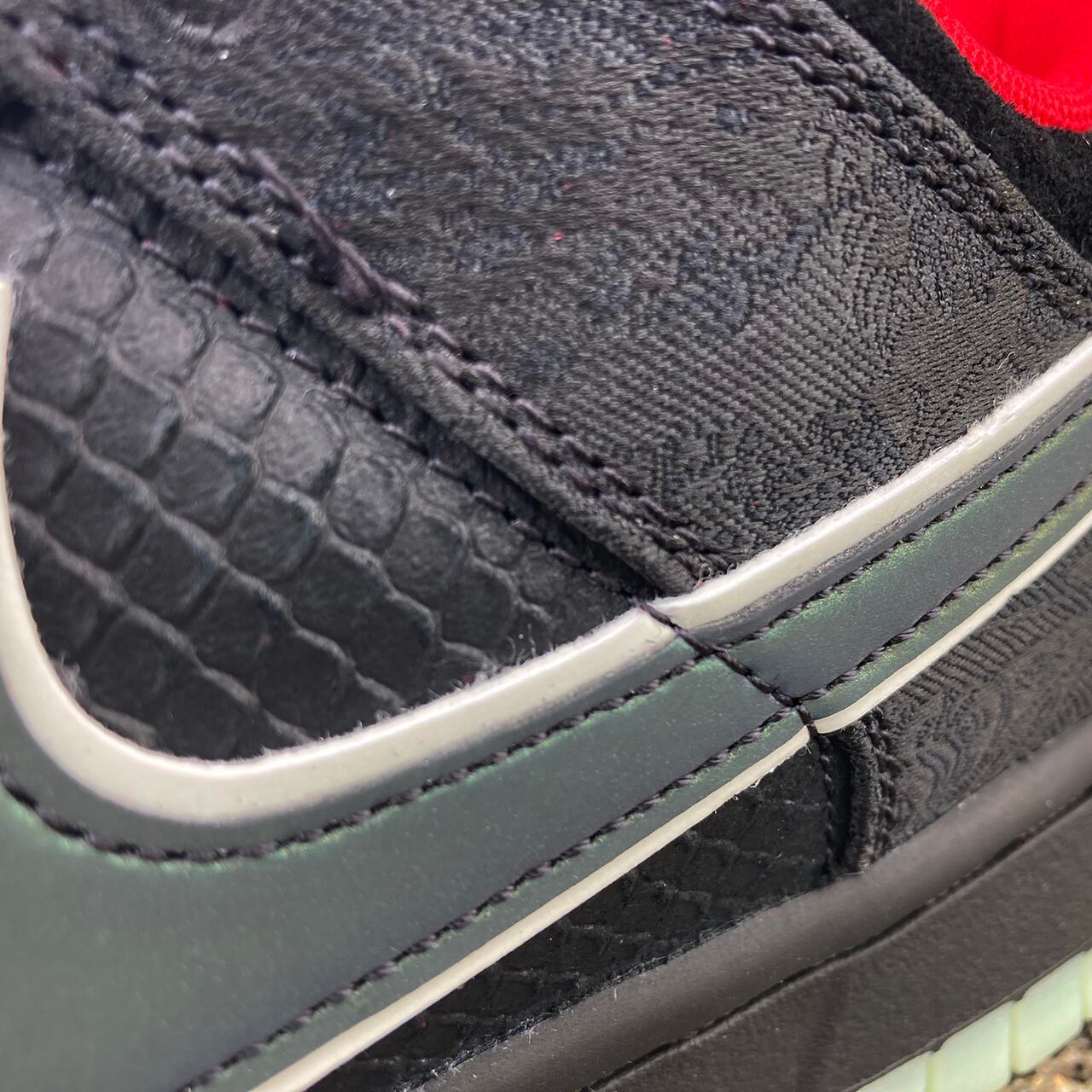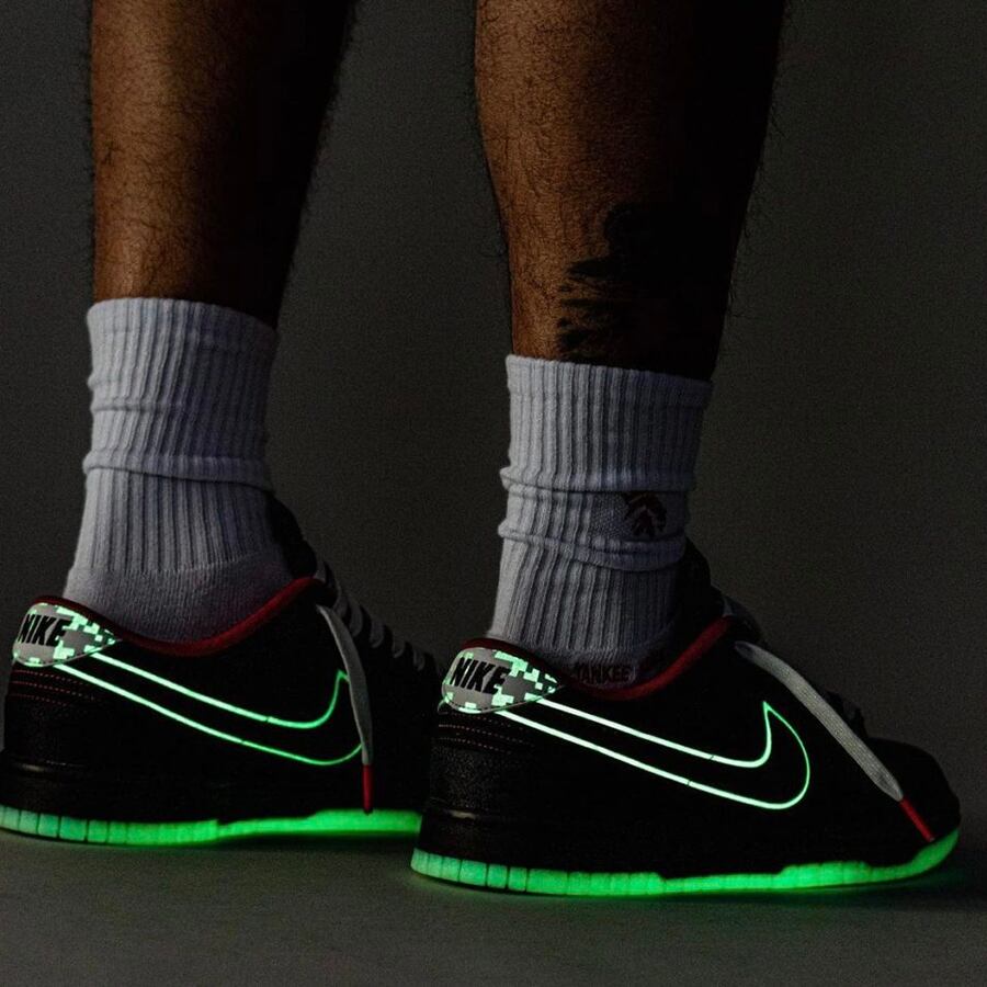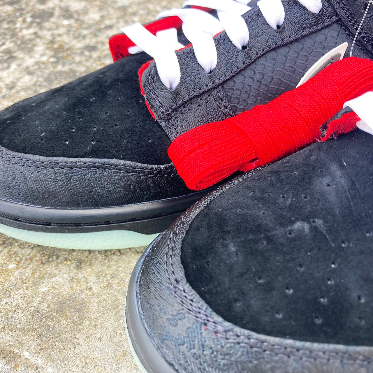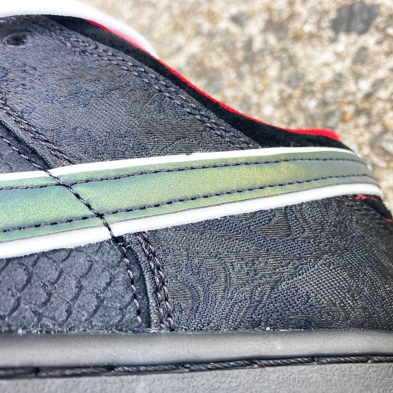 ブラックカラーのスウェード素材アッパーにリップストップ生地のクォーターパネルを組み合わせ、サイドにはイリディセントカラーのリフレクティブスウッシュロゴや、暗闇で光るグローインザダーク仕様の枠&アウトソールを配置。インソールには二つのスターをあしらい、ヒールパッチにはゲーム文化を象徴するピクセルデザインを落とし込んだ。ライナーにはアクセントとなるレッドカラーを使用し、シュータンタグには「Nike」ロゴと共に「LPL」のネームを刺繍が施されております。