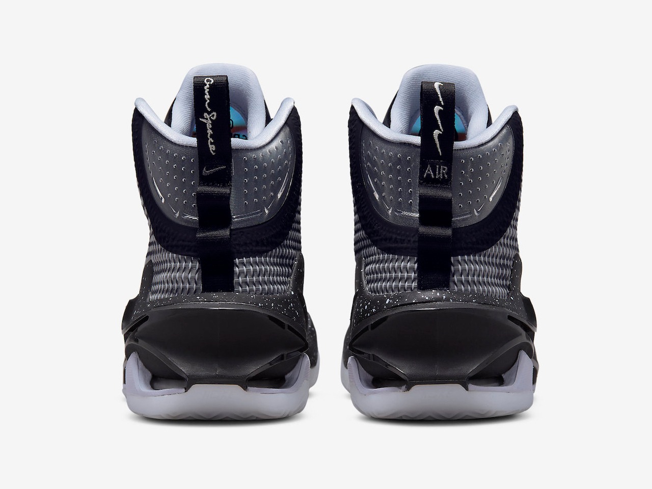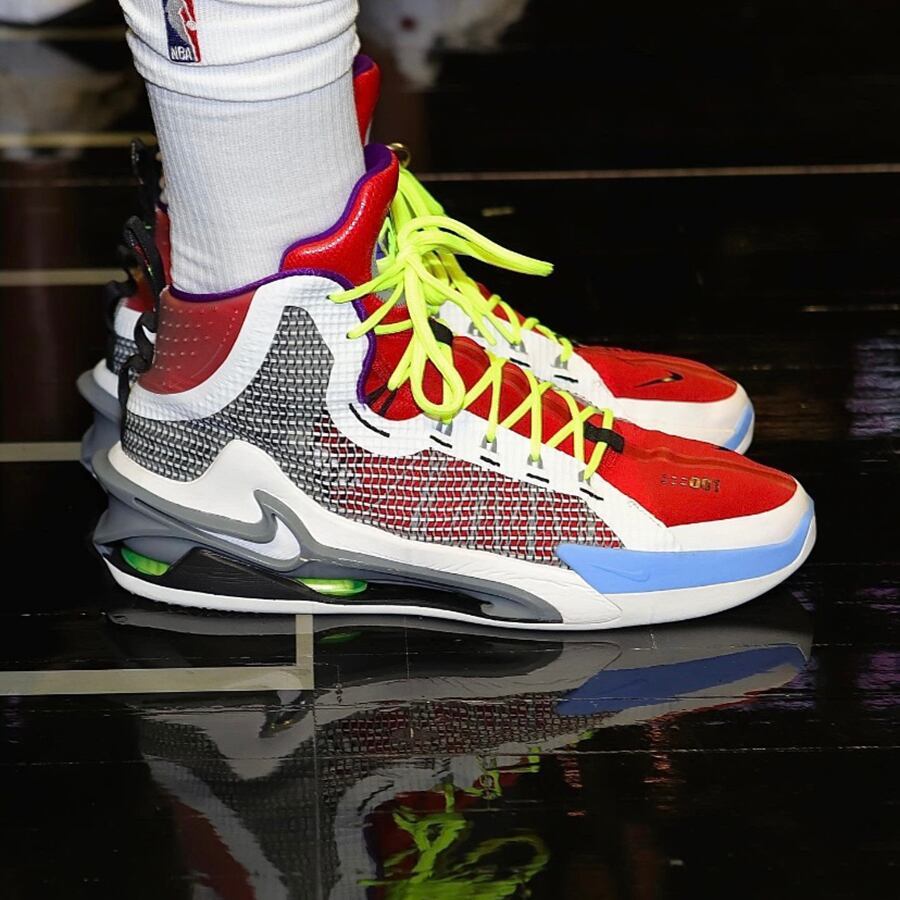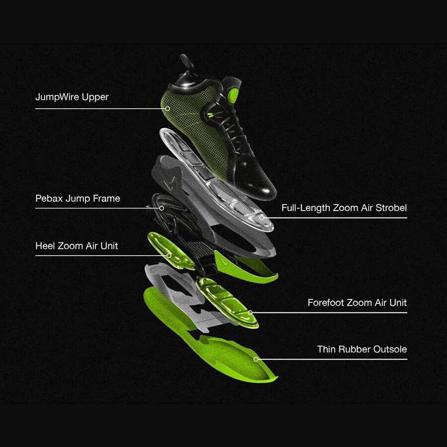 今作はジャンプにフォーカスされて作成された1足となっており、ナイキの名作「ショックス」のスピリングコアの様に積み重ねられたZoomAirシステム、フルレングスのZoom Air Strobel、Pebaxジャンプフレームがあらゆる角度の衝撃を吸収し、すぐに反発力を得られるシステムとなっております。