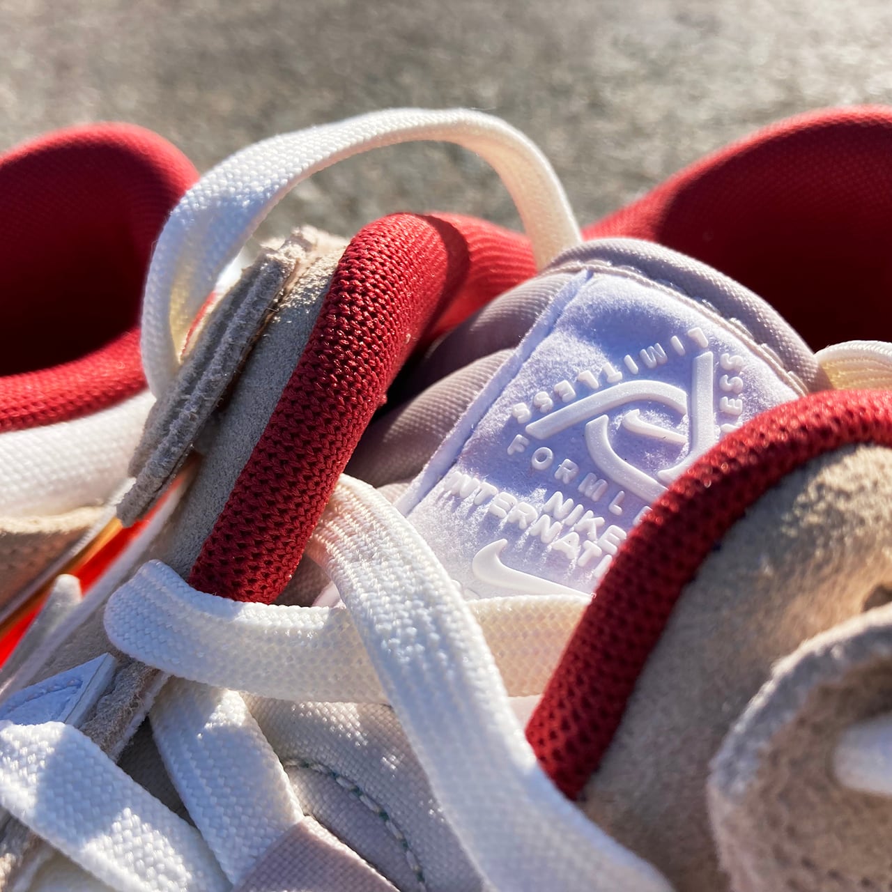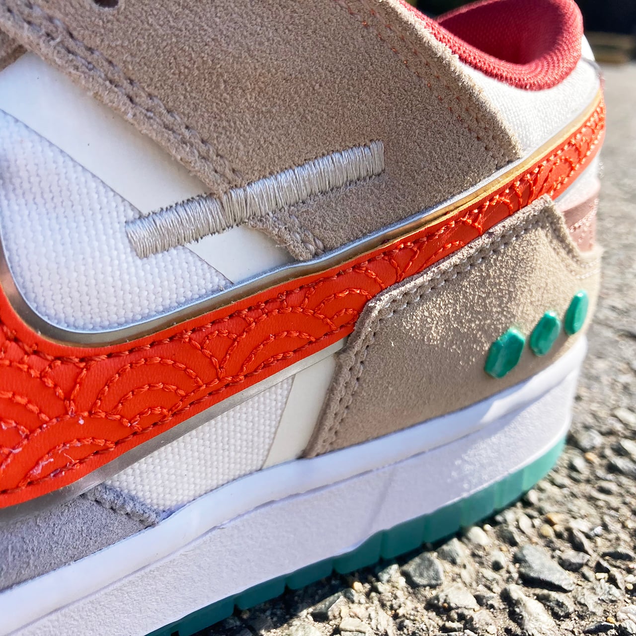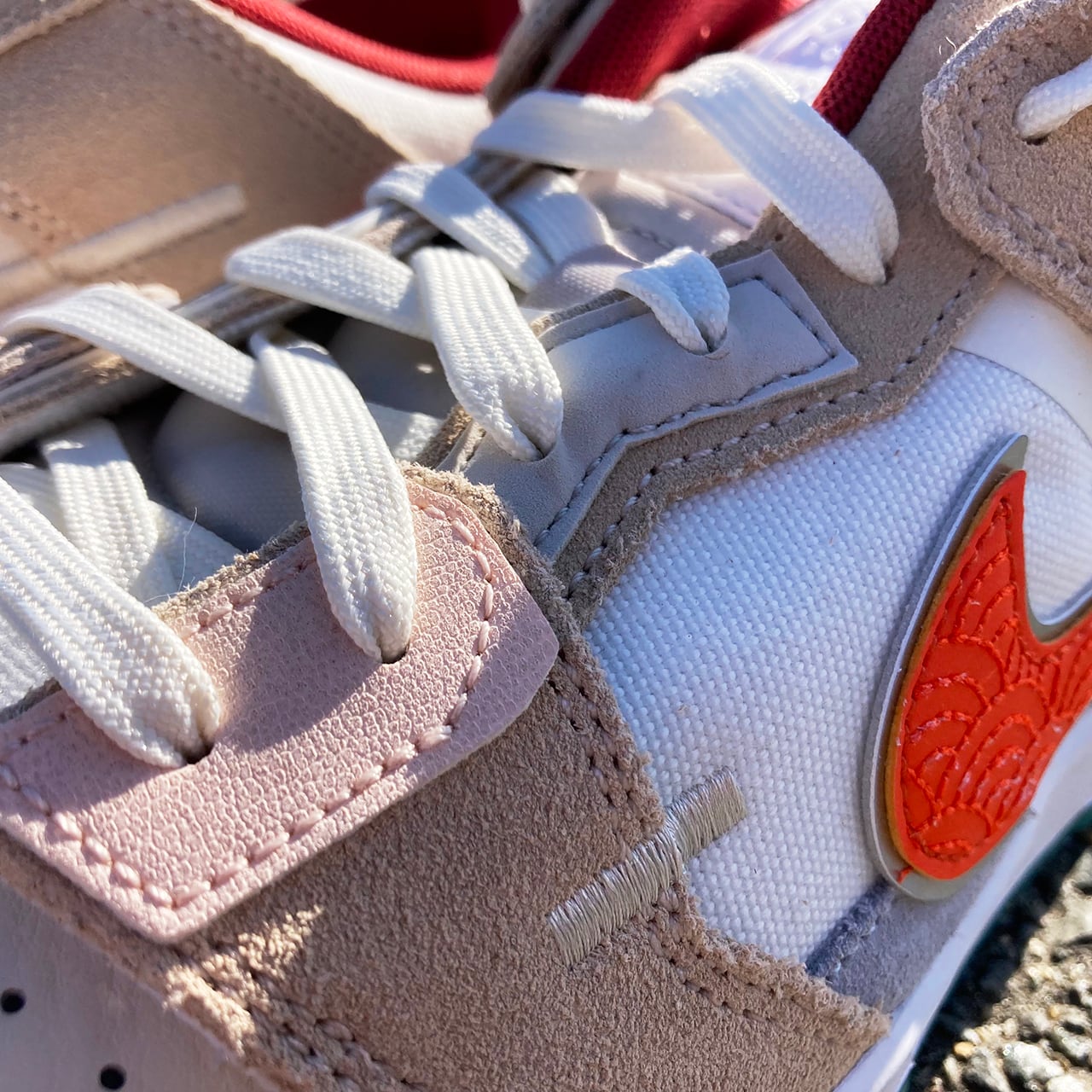 今作は、靴修理屋の裁断部屋の床をイメージしたカスタマイズスタイルが特徴的な1足に仕上がっており、スムースレザー、スウェードレザー、ナイロンメッシュなどの複数の素材が使用されています。