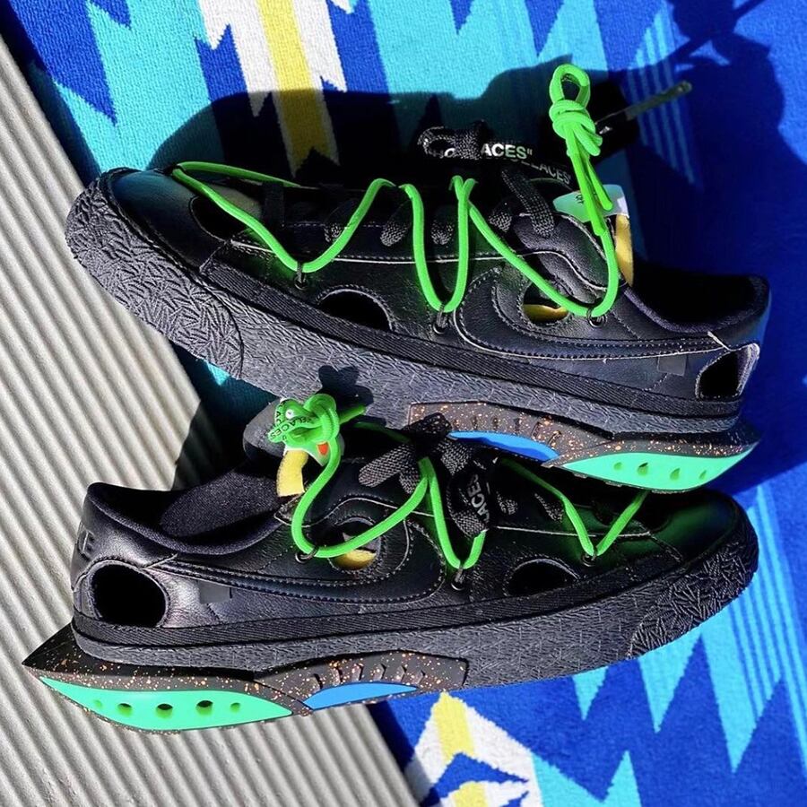最新作は"ナイキ"のバスケットシューズのルーツともいえる”BLAZER(ブレーザー)”を使い、クラシカルなデザインを一新。過去の”THE TEN COLLECTION”や”SPOOKY PACK”とは異なったアレンジで、“DUNK”と同じようにエクストラシューレースを付け加え、“AIR JORDAN V”でも見られたスニーカー内部をみせるホールが入る。