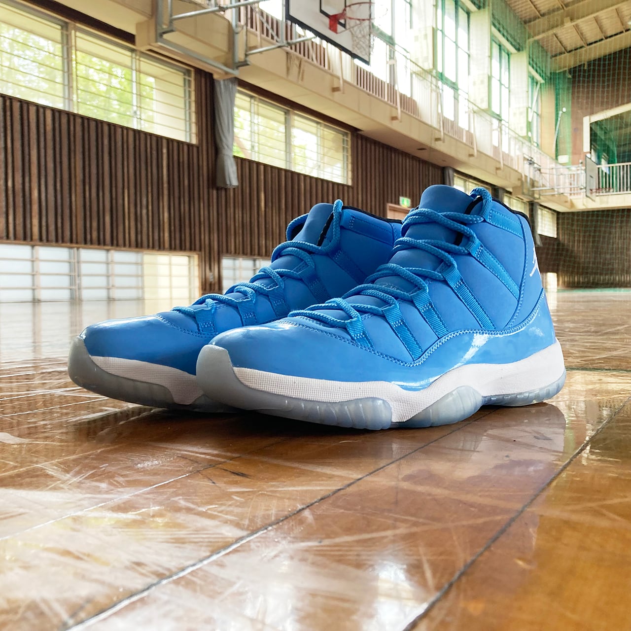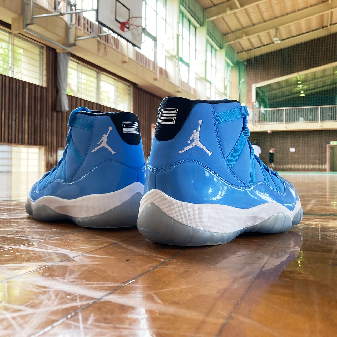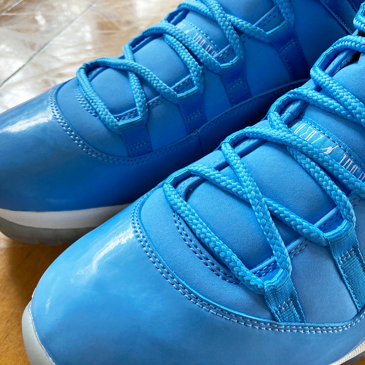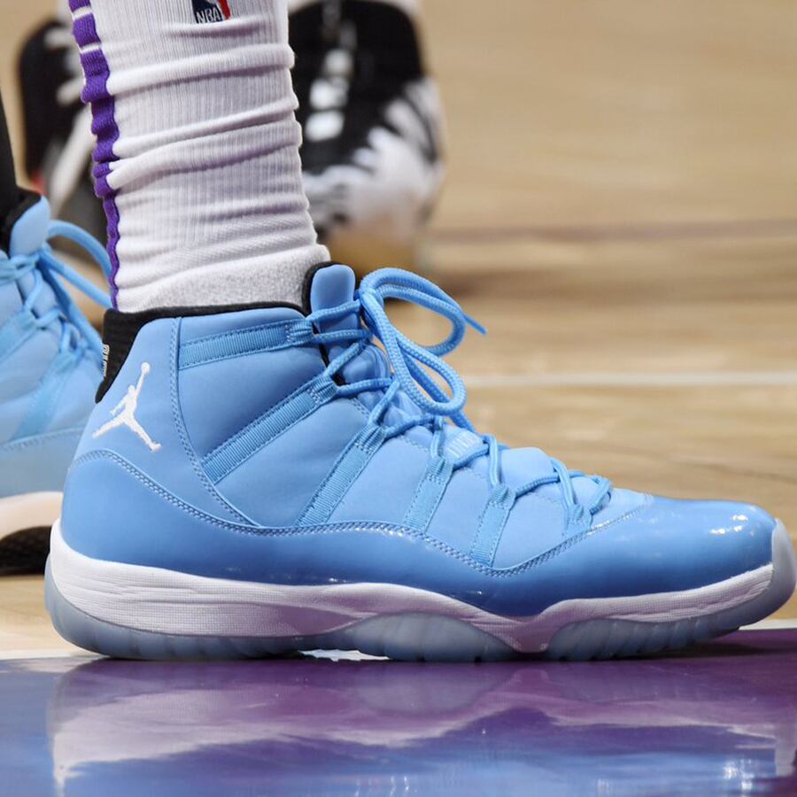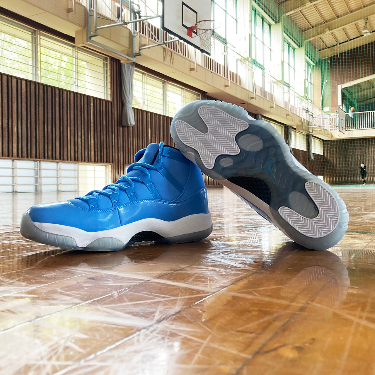 エアジョーダン11は、光沢あるパテントレザーとスムースレザーで構築しており、そして透明なアウトソールを装着して、爽やかな配色をより一層際立たせている。