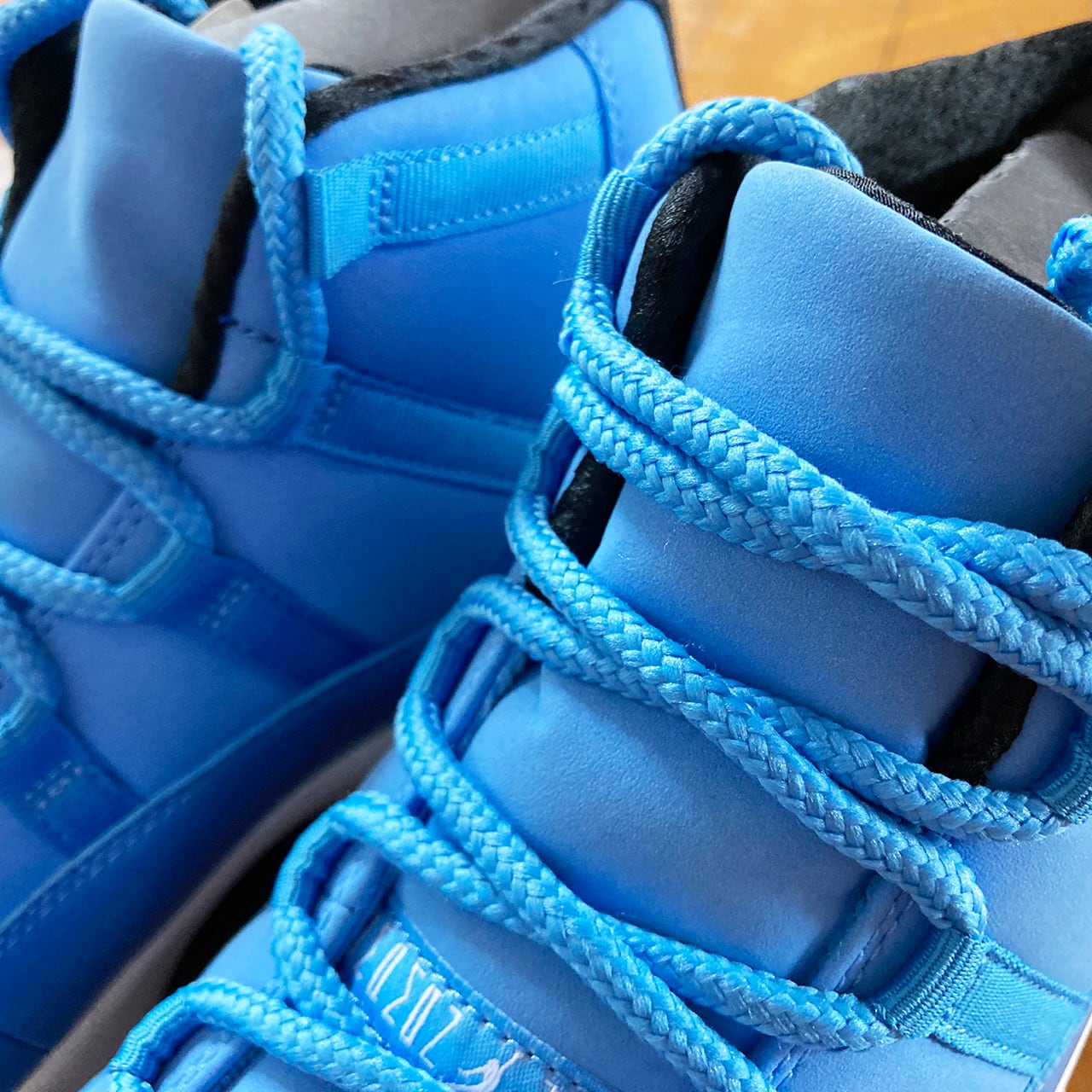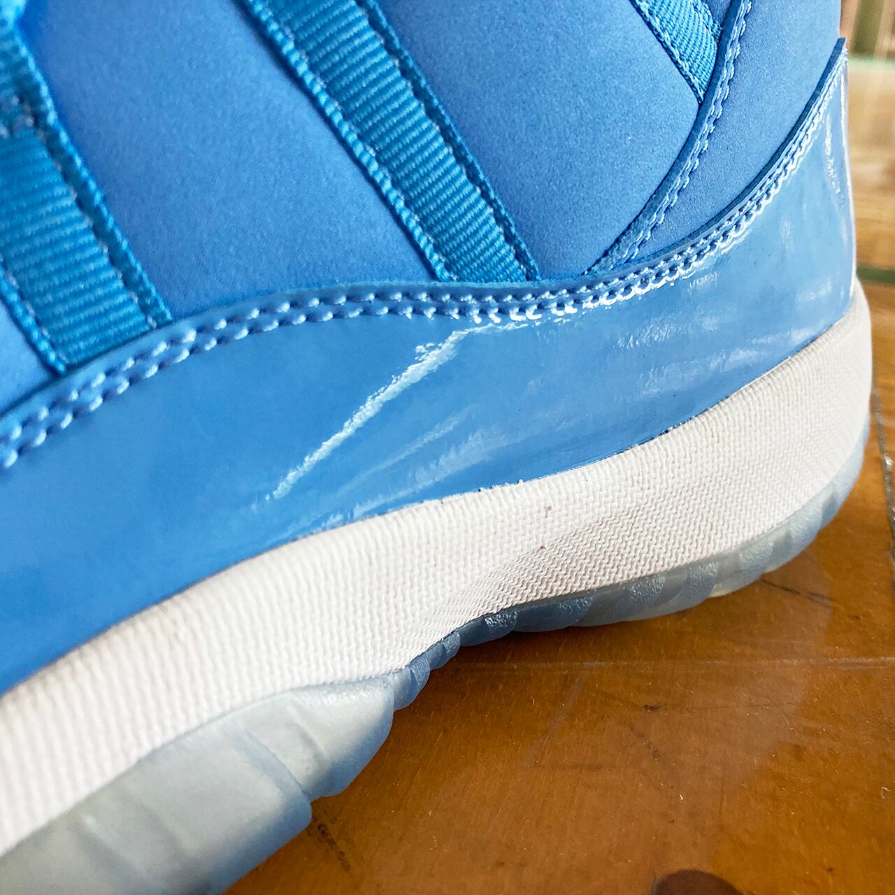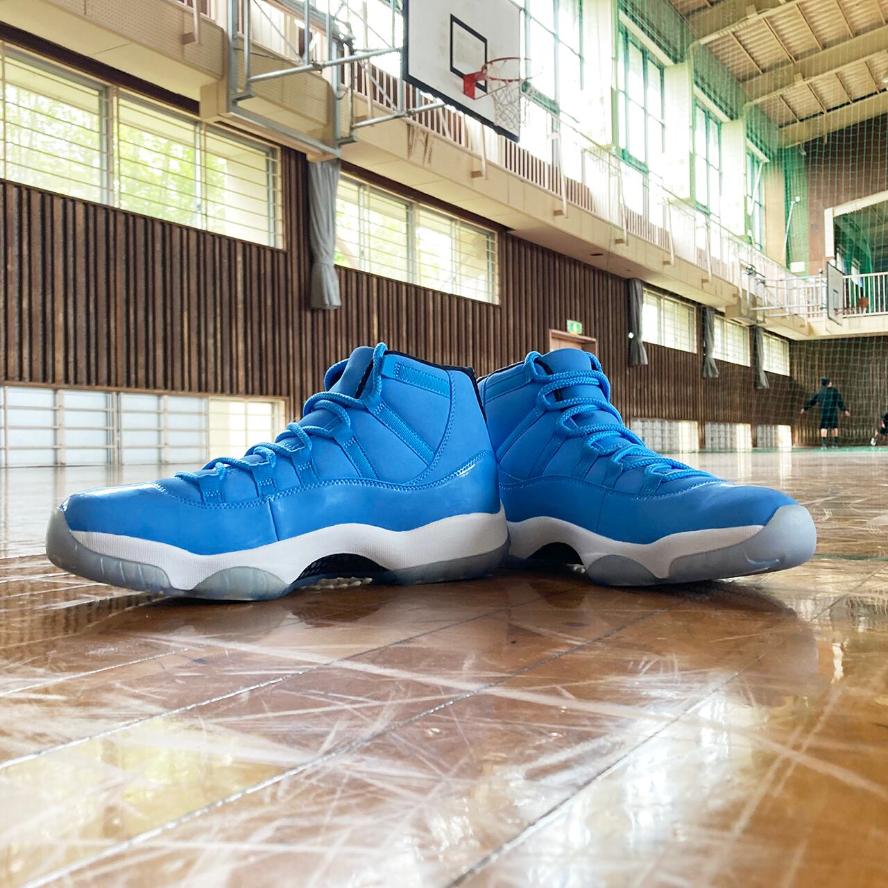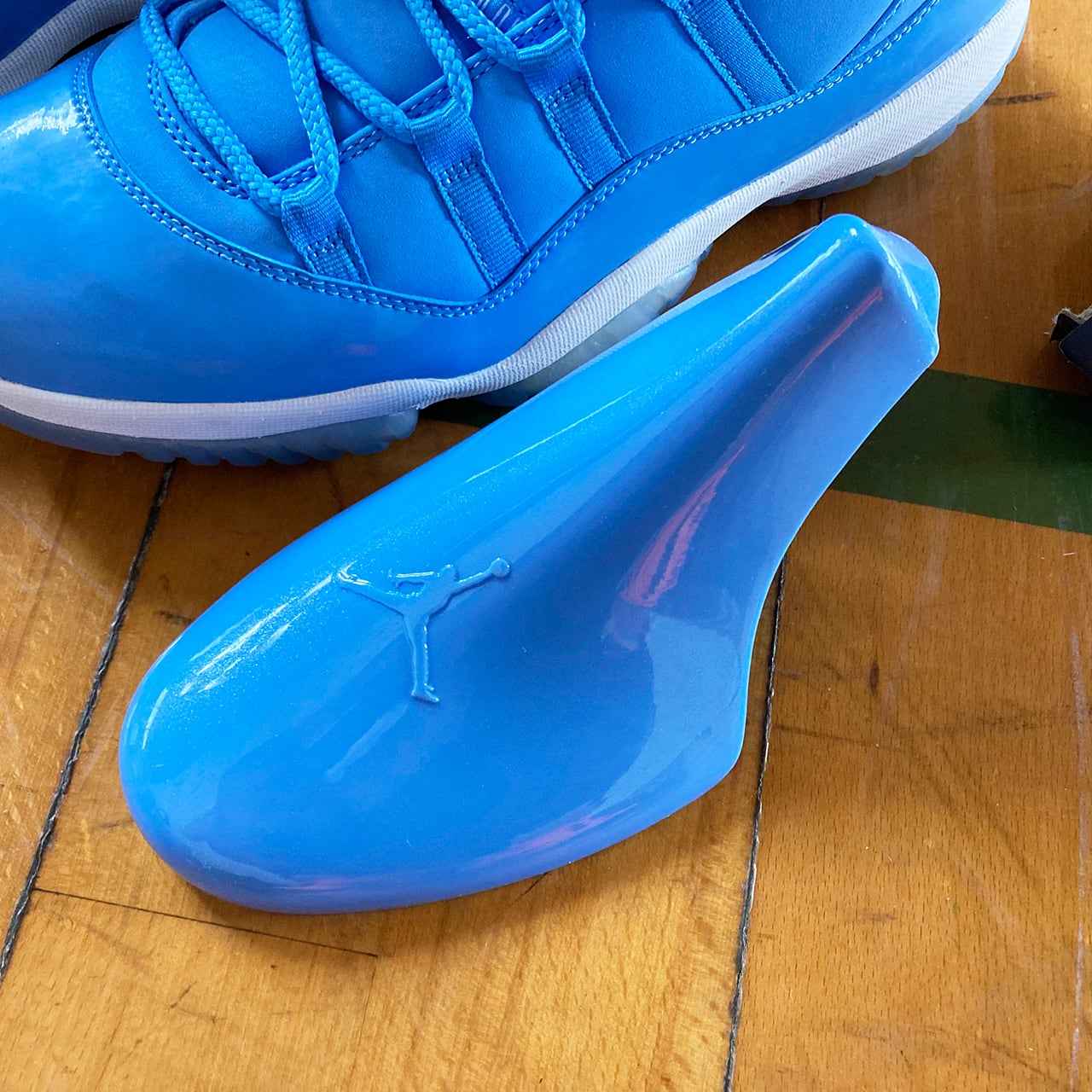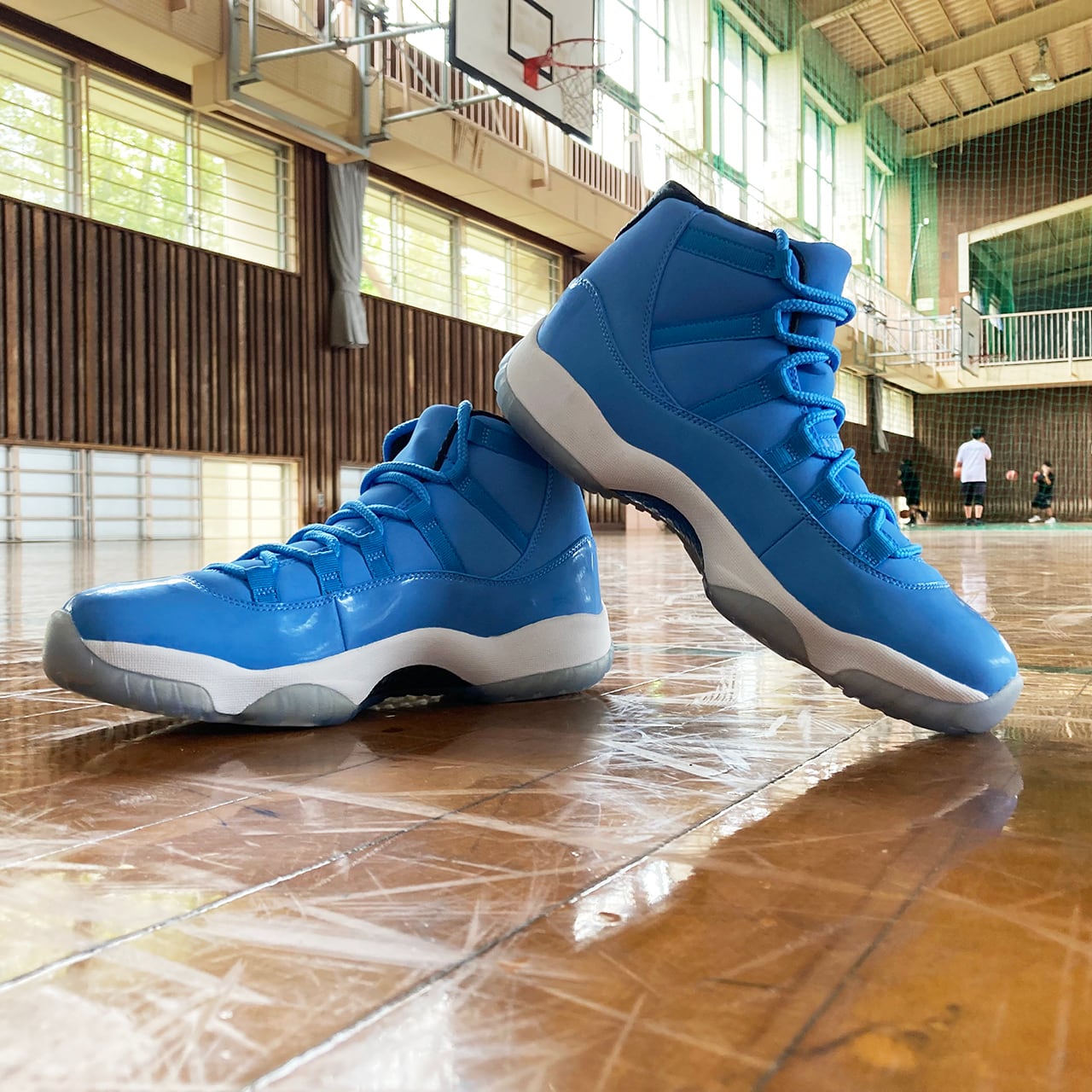 エアジョーダン11は、光沢あるパテントレザーとスムースレザーで構築しており、そして透明なアウトソールを装着して、爽やかな配色をより一層際立たせている。