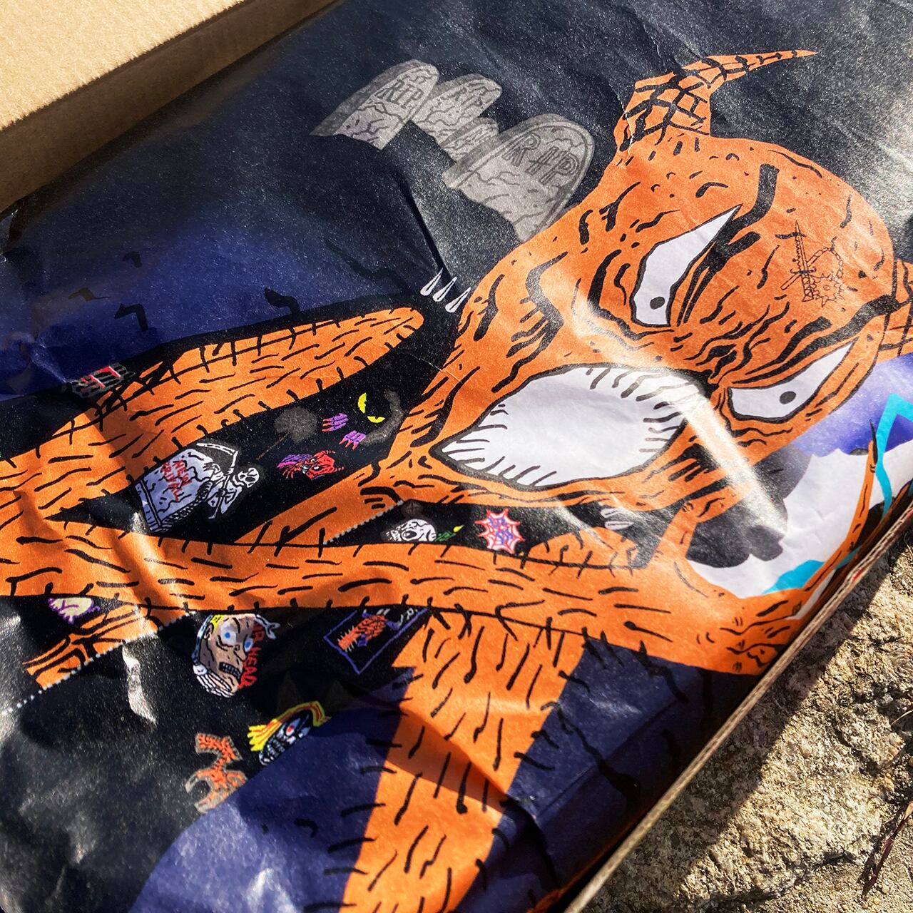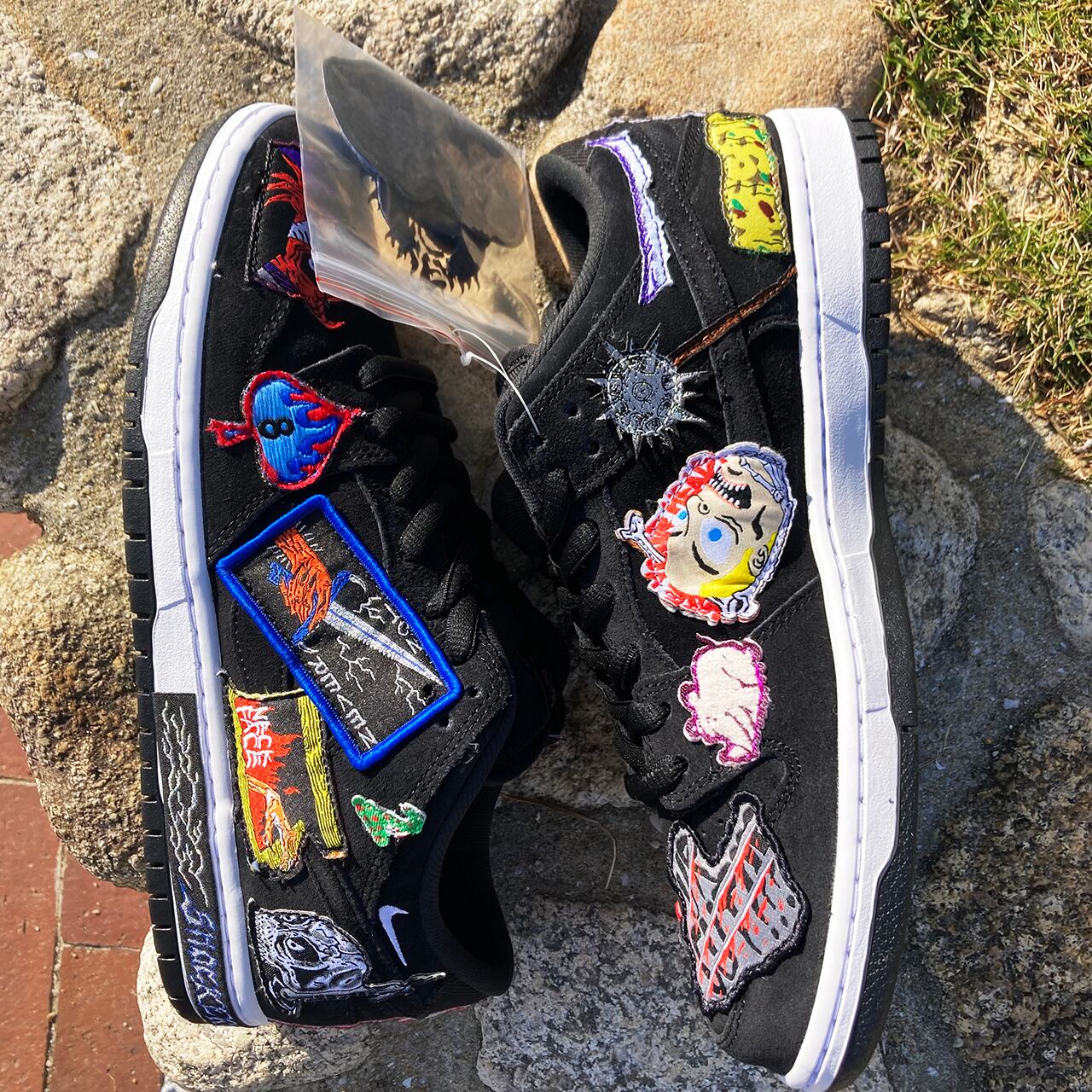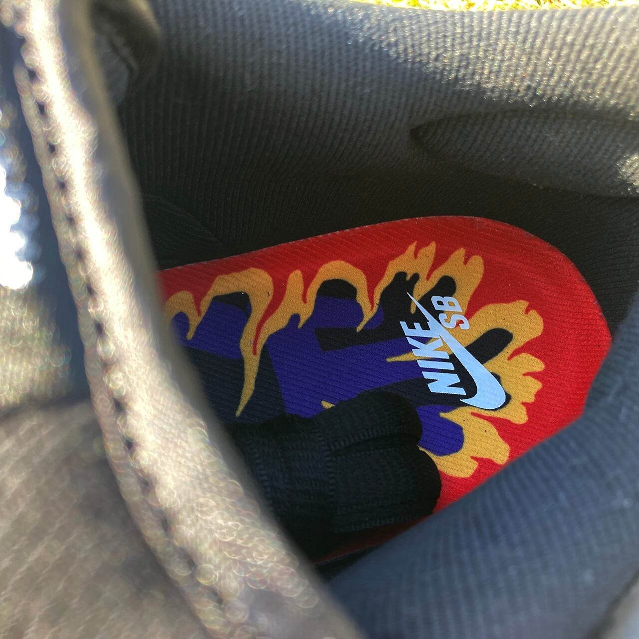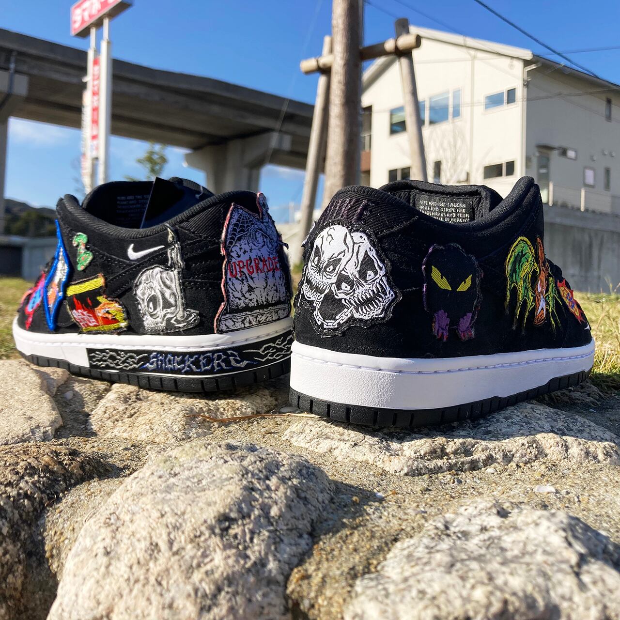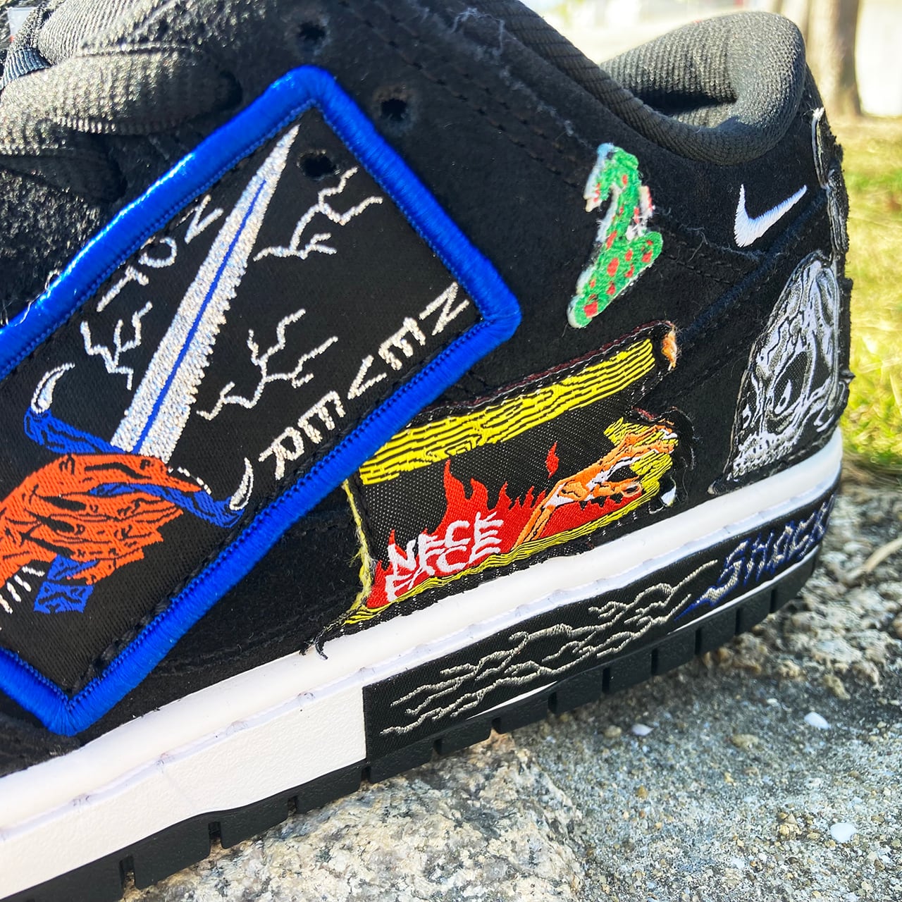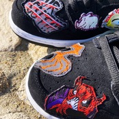 左ミッドソールの背面にある稲妻のグラフィックと「SHOCKERS」のテープ、「NECK SB」に置き換えられたシュータンタグ、炎の様なグラフィックインソールなど、シューズ全体にネック・フェイスのアートワークを落とし込んだロックな一足となっている。