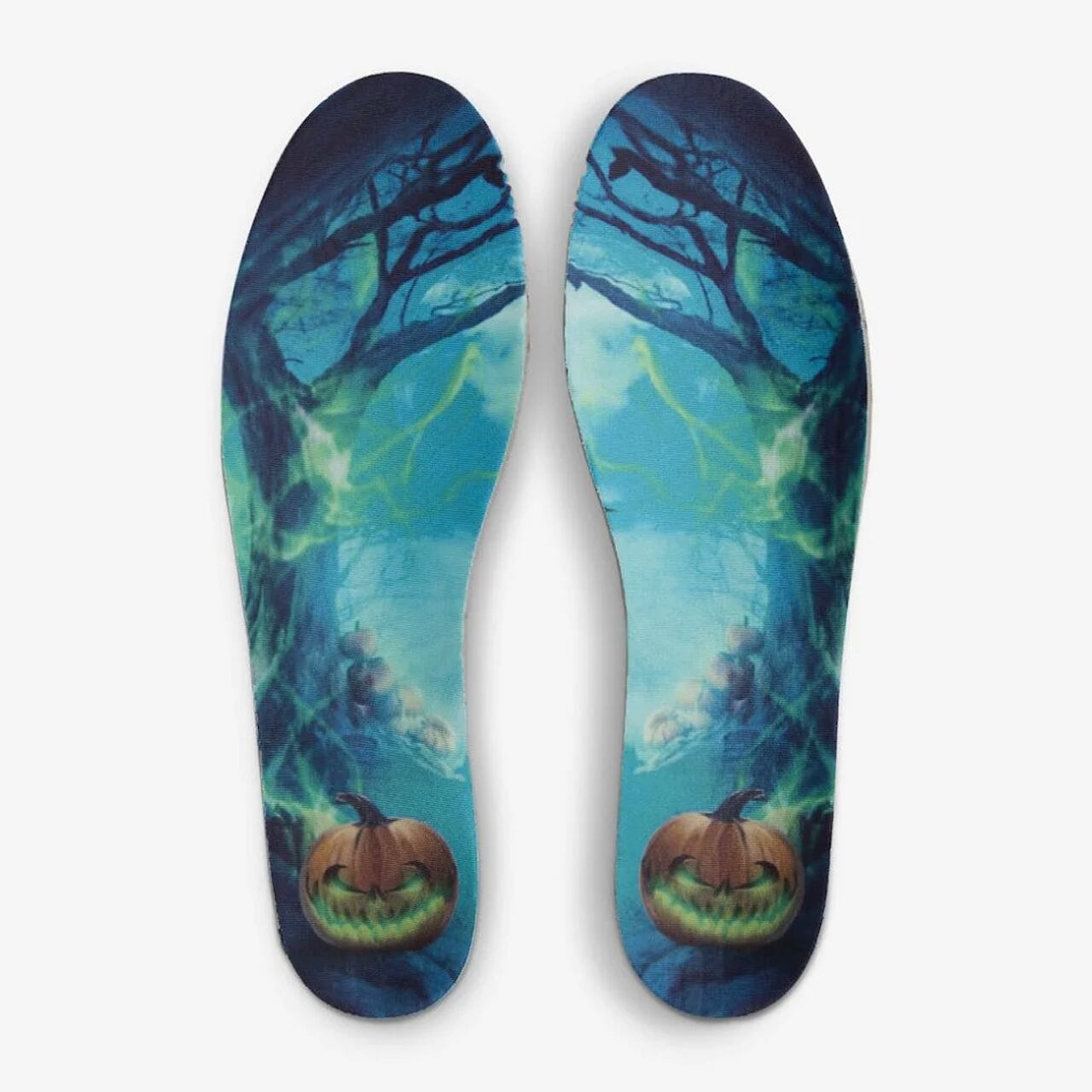 キャンプファイヤー・オレンジの筆記体ロゴが配置されたシュータンラベル、ハロウィンのカボチャのグラフィックがプリントされたインソール。