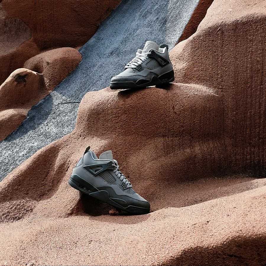 芸術的な街の石畳みを想わせるウェットなセメントカラーのアッパーはヌバックレザーとスエードの組み合わせで仕上げ、シュータンとヒールにはアイコニックなジャンプマンロゴを配置。
